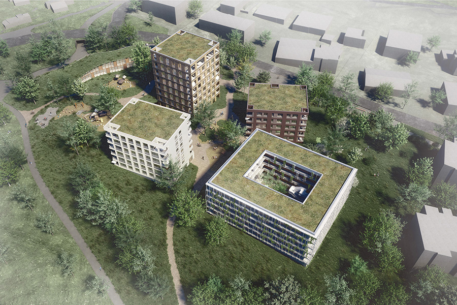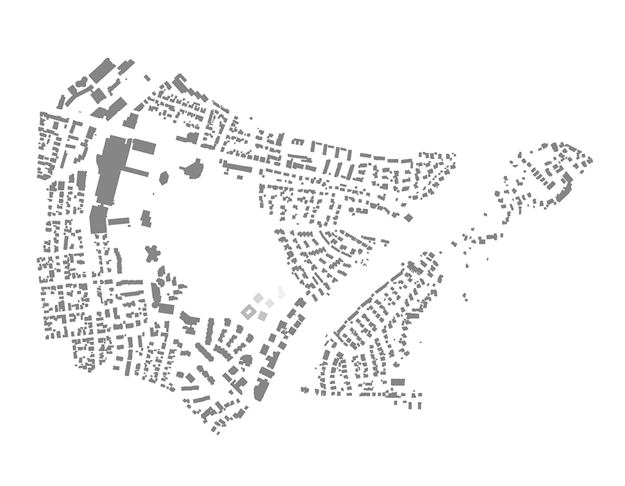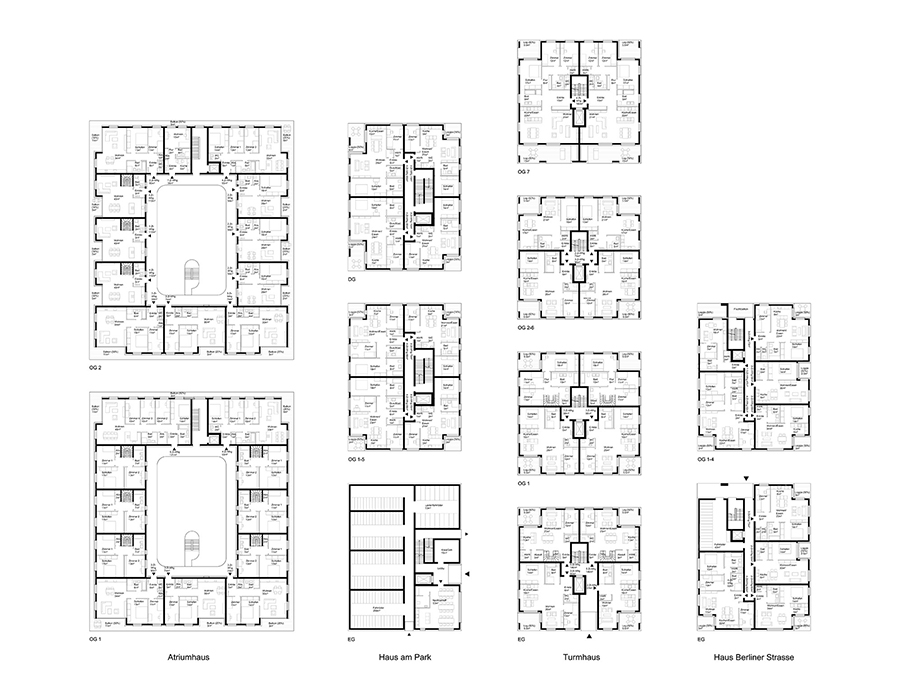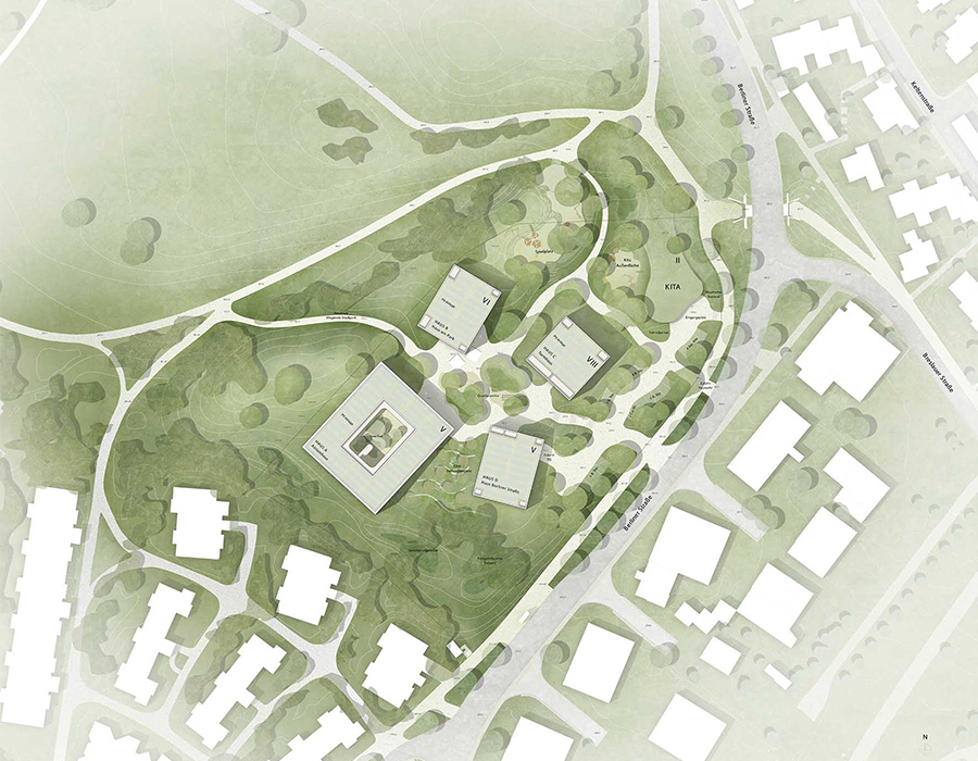 Der Quartiersentwurf fügt eine familiäre Gruppe von prägnanten Solitären in die bewegte Topografie des Stadtparks ein. Das Ensemble möchte sich dabei sowohl als lesbare Einheit von formal verwandten und aufeinander bezogenen Bauten darstellen, gleichzeitig die Kleinteiligkeit von lose angeordneten Punkthäusern ausspielen. Sowohl zum Park als auch zur Artikulierung der stadtseitigen Adresse an der Berliner Straße sind zwei der vier Häuser in verkippte Stellung gebracht. Die Anlage kann somit gestisch auf die prägenden Bedingungen der Umgebung reagieren und im gleichen Zuge einen spezifischen Binnenraum definieren. Dieser ist ein räumlich gefasster Platzbereich, eine gemeinschaftliche Mitte und die architektonische Intervention in einer überlieferten Parklandschaft. Hierbei stehen die Geometrien der Gebäude, ihre rationellen Strukturen in grafischem Kontrast zur bewegten Natur, den fließenden Höhenlinien und den umliegenden Vegetationen.