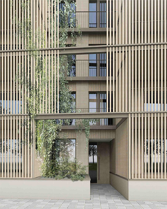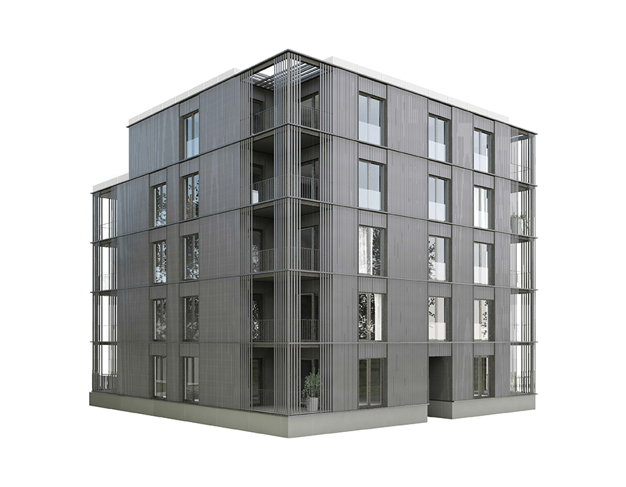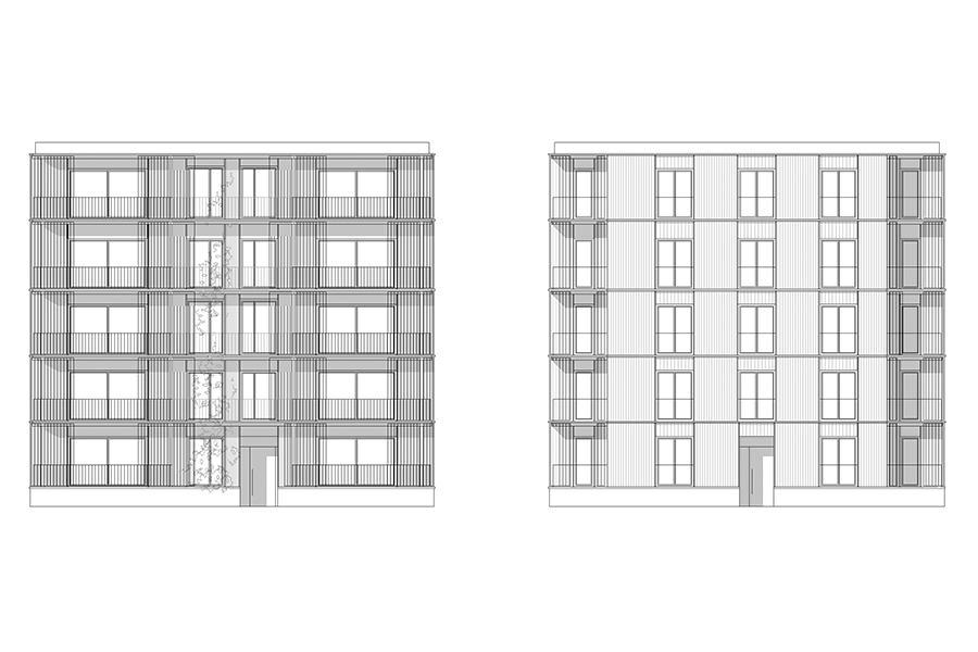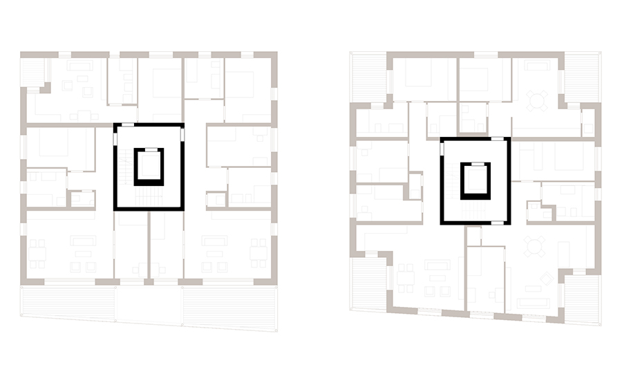 Die architektonische Erscheinung soll Verschiedenheit und Verwandschaft der beiden benachbarten Bauten zum Ausdruck bringen. Die Fügung der Loggienräume an den Hauptbaukörper, Rastermaße in der Holzverschalung, Material- und Farbwahl erzeugen die Verschiedenheit. Sockel, Dachabschluss und grundsätzliche Proportionsverhältnisse in der Fassade sind zueinander verwandt.
