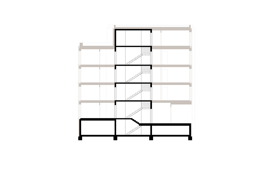 Die hybride Bauweise ist Ergebnis eines intensiv geführten Planungsprozesses mit allen beteiligten Disziplinen. Die Mischkonstruktion aus Holz, Beton und Ausbauteilen wurde hinsichtlich Co2 Bilanz und Ökonomie genau austariert.